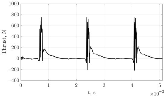 Figure 10 shows the change in thrust over time for all three cycles. At the stage of fuel supply, the thrust is minimal, then increases sharply, giving several peaks, then drops rapidly at first, after which it reaches almost zero.