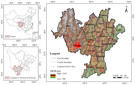 The Liangshan Yi Autonomous Prefecture (26°03′~29°18′ N, 100°03′~103°52′ E) is located in the southwest of Sichuan Province, China, and on the northeast margin of the southwest Hengduan Mountain Region between the Sichuan Basin and the central Plateau of Yunnan Province; the total area is 60,423 km² (Figure 1). The terrain is high in the northwest and low in the southeast. Its landforms are complex and diverse; the highest elevation point in the territory is the Chalangdorj Peak in Muli County, reaching an altitude of 5958 m, while the lowest elevation point is at the bottom of Jinsha River Valley in Danyandong, Leibo County, at only 325 m, with a maximum relative height difference of 5653 m. The Liangshan Yi Autonomous Prefecture is characterized by a subtropical monsoon climate with distinct dry and wet features, but the boundary between the four seasons is not obvious. Due to its topographic differentiation and complex and diverse landforms, the Liangshan Yi Autonomous Prefecture has obvious vertical characteristics associated with a mountain climate. The annual average temperature is about 16–17 °C, the precipitation is about 1003 mm, and the sunshine hours are as high as 1967.2 h. Among them, in Huili, Huidong, Ningnan, Puge, and other dry and hot valley areas, the average annual temperature is 20–27 °C, and the annual precipitation is only 600–800 mm. Coupled with the influence of atmospheric circulation, it also has a complex and diverse climate. At the same time, the Liangshan Yi Autonomous Prefecture has a vast territory and rich forest resources, making it one of the three major forest regions in Sichuan Province. However, Liangshan Prefecture belongs to a forest-fire-prone area and endures severe forest fires, which have become especially commonplace in recent years. In March 2019, a forest fire in Muli resulted in the deaths of 31 rescue workers and damaged a forest area of 43.90 hectares. In March 2020, a forest fire in Xichang resulted in the deaths of 19 people, a damaged forest area of 791.6 hectares, and direct losses of up to CNY 97.32 million. Since 1951, the annual average surface temperature in China has shown a significant upward trend with an average increase of 0.26 °C per decade. The number of precipitation days has decreased, but the intensity of precipitation has increased significantly [40]. With the continuous emergence of extreme weather, the prevention and control of forest fires is becoming increasingly important.