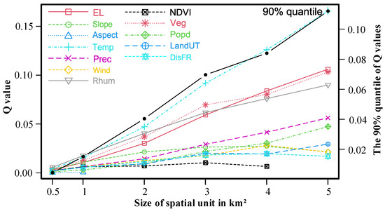 Comparative results of Q values and 90% quantile effects of explanatory variables at different spatial unit scales, including elevation (EL), slope, aspect, temperature (Temp), precipitation (Prec), wind speed (Wind), relative humidity (Rhum), vegetation cover type (Veg), NDVI, land use type (LandUT), population density (Popd), and distance from road (DisFR).