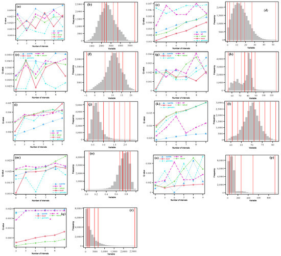 In this study, the optimal combination of the discretization method and the number of outages of each geographically continuous variable was selected as the optimal discretization parameter. The Q value calculated with the geographic factor detector was used to determine the optimal parameter combination. A combination of a set of discretization methods and the number of interrupts was provided for each continuous variable to calculate their respective Q values. The optional discretization method could be a list of supervised and unsupervised discretization methods, and the optional breakpoint number could be an integer sequence of observation and actual requirements.