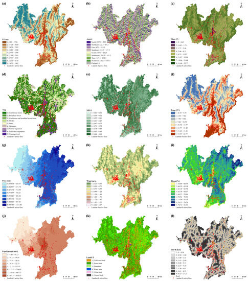 Reclassification of driving factors: (a) EL; (b) aspect; (c) slope; (d) Veg; (e) NDVI; (f) Temp; (g) Prec; (h) Wind; (i) Rhum; (j) Popd; (k) LandUT; (l) DisFR.