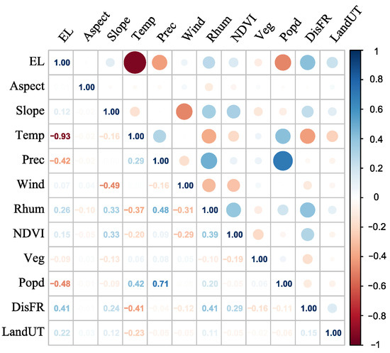 According to the results of the Spearman correlation analysis (Figure 5), the variables of EL except aspect were extremely significant (P < 0.01), and the average correlation coefficient was 0.289. To avoid the conflict variables with high correlation, which resulted in overfitting of the future model, the EL variable was eliminated.
