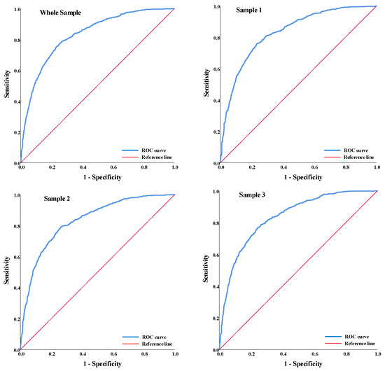 The fitting results of the ROC curves showed that the AUC values of Sample 1, Sample 2, Sample 3, and the whole sample dataset were 0.831, 0.832, 0.837, and 0.830, respectively; the AUC values of the sample datasets were close to each other and were much higher than 0.5. The prediction accuracy of the test sample data of each sample group exceeded 80%, and the average value was 80.99% (Figure 6 and Table 3), which showed that the OPLR model fitted better and had a higher prediction accuracy.