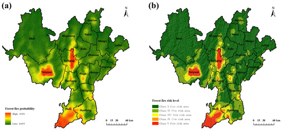 Spatial distribution of forest fire probability and risk level zoning: (a) forest fire probability; (b) forest fire risk level.