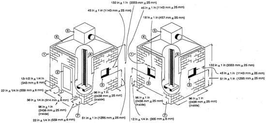 We provided a detailed explanation of the process by which the experiment is performed in Figure 1. First, this is an explanation of cables and cable trays. The cables are attached to the cable trays and pretreatment is performed. The tray is installed parallel to the wall of the chamber, and the cable is installed such that the end of the sample touches the top of the burner. Second, the flow rate of the exhaust duct is adjusted to be 0.65 m3/s ± 0.02 m3/s. Third, the burner is installed horizontally at an angle of 20 degrees and separated by 75 mm from the sample surface. This propane flow is theoretically equivalent to a 20 kW heat release, but the actual heat release is lower due to incomplete combustion of the burner. Fourth, the airflow rate is set to 1280 cm3/s ± 80 cm3/s under standard temperature and pressure. Finally, the flame of the burner continues to ignite the sample for 20 min. When the test is finished, the flame of the burner is turned off and the cable is left burning until it is self-extinguished.