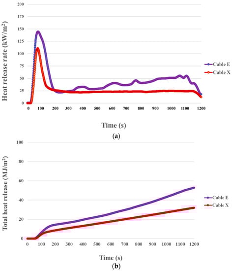 The results shown in the cable HRR curve confirm that the HRR of Cable E was not constant after the PHRR, as change occurred from 200 s until the end of the experiment. By contrast, Cable X’s HRR curve showed no significant change after one PHRR. This heat release characteristic was also reflected in the THR curve. This is attributed to the EPR-based cable insulation.