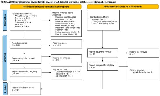 The databases accessible through Scopus [], Web of Science [], Agris [], Treesearch [], arXiv [], and bioRxiv [] were searched with the keywords “urban AND interface AND fire” up to 31 December 2022. No filters were imposed with case-by-case selection after retrieval. External entries were obtained from other research engines (Google [] and Google Scholar []), from bibliographies of retrieved publications, and from suggestions by colleagues. These publications were contextually checked for duplication and eligibility. Only full text, readily available publications were retained in the process. Data used for further analysis were retrieved by reading the full text of the publications collected at the final stage of the selection.