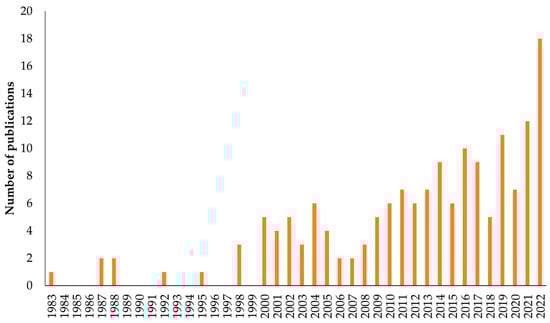 The time range of publication was 1983–2022. There was a steady increase in the number of publications throughout the period, with a peak in 2022 (18 publications, Figure 2).