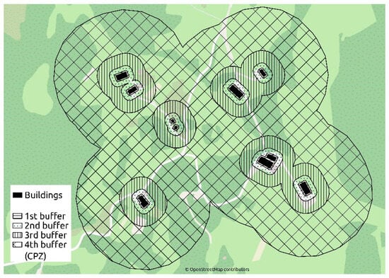 Illustrative example of buffer areas around buildings including an outer community protection zone (CPZ).