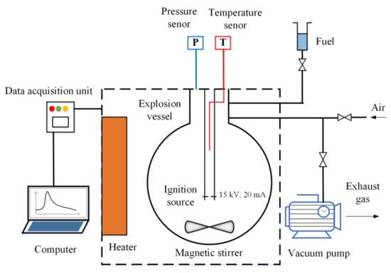 In this study, the experimental apparatus was built according to ASTM E681-04 “Standard Test Method for Concentration Limits of Flammability of Chemicals (Vapors and Gases)” []. A schematic diagram of the experimental system is shown in Figure 1. The main component of the system is a 5 L spherical vessel made of stainless steel. Four parts are equipped, including the ignition source, heater, detection unit, and gas distribution unit. The ignition source is an electric spark generator that can provide enough energy to ignite the fuel–air gaseous mixture. It can produce electric sparks between two electrodes through a 15 kV voltage and 20 mA current. The heater is used to raise the temperature inside the vessel by means of infrared radiation and hot air circulation. The detection unit is composed of a pressure sensor and temperature sensor, which are responsible for detecting the pressure and temperature data inside the vessel and transferring these data to the data acquisition unit, respectively. The measuring range of the pressure sensor is 0~2 MPa, with a resolution of 0.1 kPa, and the measuring range of the temperature sensor is 0~1350 °C, with a resolution of 0.1 °C. The gas distribution unit is composed of a magnetic stirrer, vacuum pump, fuel feed line, and gas feed line. This unit is responsible for preparing a homogeneous fuel–air gaseous mixture through the partial pressure method. In addition to the four parts, a data acquisition unit was used to record the pressure and temperature data and transmit them to a computer. It can record data every 0.2 ms, with an acquisition time of 2 s. A computer, as a controller, is used to operate the experiment and store the data.
