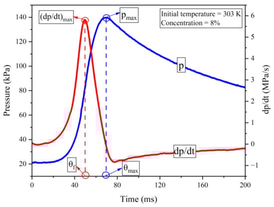 Pressure and dp/dt curves of one test at 303 K and 8% concentration.