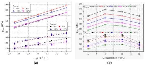 Figure 3a shows the variation in pmax with 1/T0 at different ethanol concentrations, where the simulation data pmax,ad are illustrated by hollow points and the measured data pmax,exp are illustrated by solid points and error bars. Due to the heat loss in practical circumstances, pmax,ad is much greater than pmax,exp for all conditions. However, it has the same variation trend as the initial temperature.