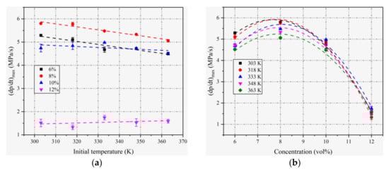 For all concentrations in this paper, (dp/dt)max appears to decrease or at least approach a constant value as the initial temperature increases, which results from the overall influence of the initial temperature on (dp/dt)max. A similar variation trend against concentration is observed for (dp/dt)max compared with pmax.