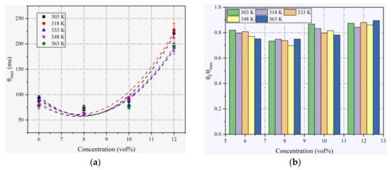 (a) Variation in θmax with ethanol concentration at different T0; (b) ratios of θf/θmax in different T0 at different ethanol concentrations.