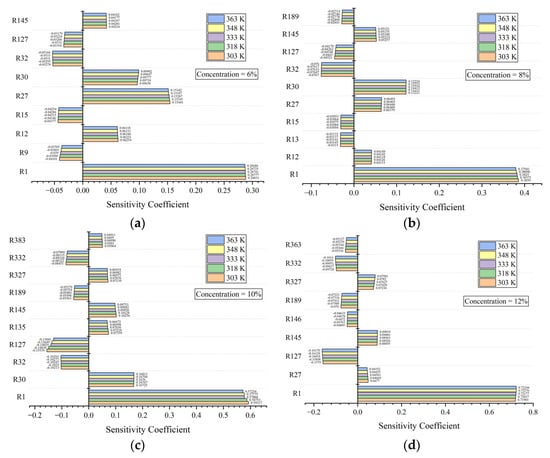Sensitivity coefficients of the main reactions at four concentrations, (a) at 6%, (b) at 8%, (c) at 10% and (d) at 12%.