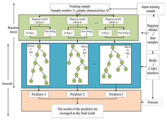 The Random Forest (RF) is a generalization of Bagging’s idea on the basis of the decision tree algorithm and Ensemble learning algorithm [,]. Using the CRAT decision tree as the weak learner and building on the use of the decision tree, the following improvements are made to the decision tree: for a general decision tree, the best feature will be selected from the n sample features at a node as the left and right subtrees of the decision tree. In contrast, the Random Forest randomly selects some sample features from the nodes and computes the best feature to complete the split of the left and right subtrees of the decision tree. This can avoid certain overfitting features and eliminate any pruning of the decision tree, resulting in high accuracy and generalization performance of the overall model results. The RF structure is illustrated in Figure 1.