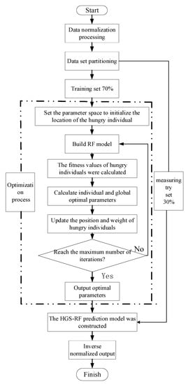 The RF model has a strong performance in dealing with regression problems, but because the training accuracy is affected by the number of trees and the parameter setting of the smallest leaf node, the manual adjustment of its parameters is often subjective. In addition, the number of trees is too large to significantly improve the model performance, and the phenomenon of “underfitting” is prone to occur when the number of trees is too small. Therefore, HGS, with strong global search ability, fast convergence speed and good stability, was introduced to optimize its two key parameters so as to improve the model performance and thus establish a borehole spontaneous combustion prediction model based on HGS-RF. The build process is shown in Figure 2, The steps of construction are as follows: