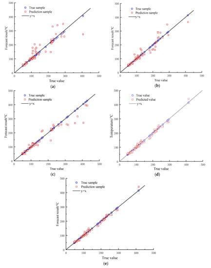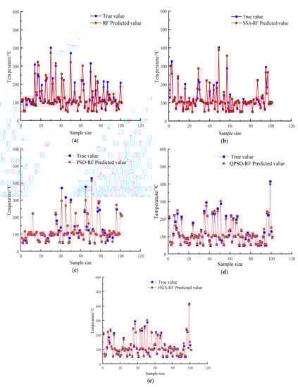 Comparison of the real and predicted values for different model test samples. (a) RF model; (b) SSA-RF model; (c) PSO-RF model; (d) QPSO-RF model; (e) HGS-RF model.