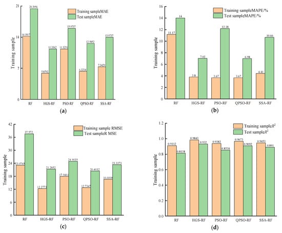 The results showed that the prediction model based on HGS-RF model was the best in terms of the MAE, MAPE, RMSE and R2, compared with the RF, SSA-RF and PSO-RF models. The MAPE was 1.52% higher than the QPSO-RF model, and the RMESE was 1.5509 higher than the QPSO-RF model. However, the R2 was also higher by 0.0138, the MAE was lower by 2.5247 and the running speed was the fastest among the five models, 2.371 s faster than the QPSO-RF model. Therefore, HGS-RF showed good accuracy, generalization performance and fast operating speed. The results show that the HGS-RF algorithm has strong universality, stability and excellent practicability.