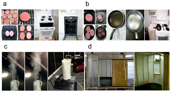 Test samples based on alarm scenarios of unwanted fires: (a) Grilled hamburger patties in an oven; (b) fried hamburger patties in a frying pan; (c) boiled water in a coffee pot; (d) hot water in a shower room.