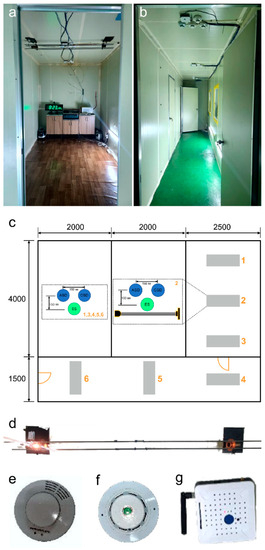 Configuration of the mock-up and devices: (a) Room 1; (b) Corridor; (c) Placement of detectors and sensors; (d) Optical density meter; (e) Analog smoke detector; (f) Conventional smoke detector; and (g) Environmental sensor.