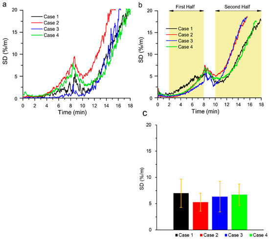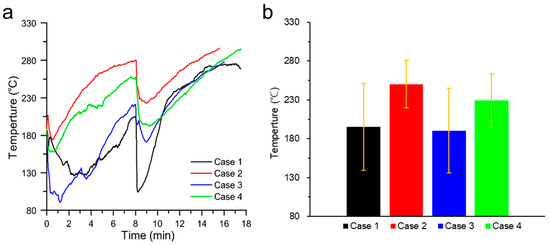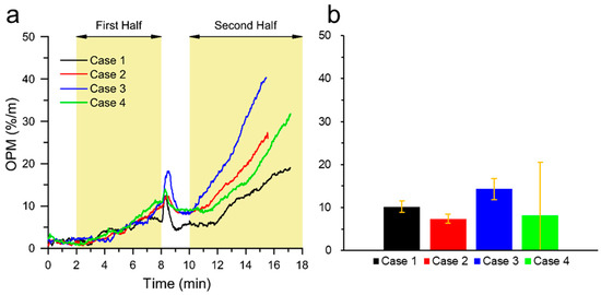 Figure 3a illustrates the results of the OPM measurements, displaying the average OPM values obtained from the three repeated measurements for Cases 1 to 4. Figure 3b is the three repeated measurements OPM’s standard deviation by bar. Deviation, despite variations in the overall OPM levels and due to factors, such as material type and position, resulted in similar patterns when examining the tendencies across the three experiments conducted for each case. This consistency may have been influenced by the surface temperature of the frying pan for each case, as shown in Figure 4, as well as the relative humidity specific to each case, as depicted in Figure 5. Figure 4b and Figure 5b represent the standard deviation of all experiments per case.