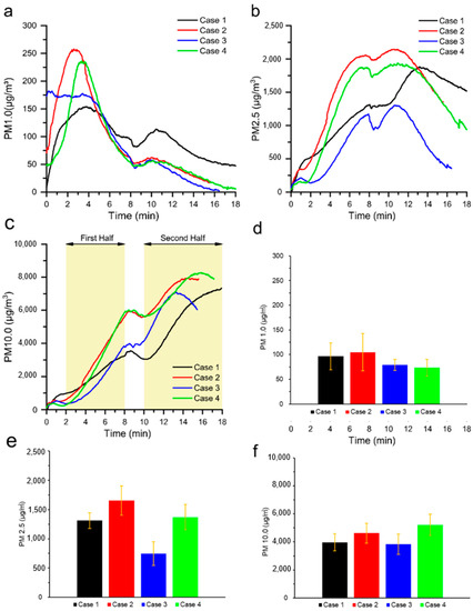Microgram per cubic meter over time of particulate matters: (a) PM1.0; (b) PM2.5; (c) PM10.0; (d) Standard deviation of PM1.0; (e) Standard deviation of PM2.5; (f) Standard deviation of PM10.0.