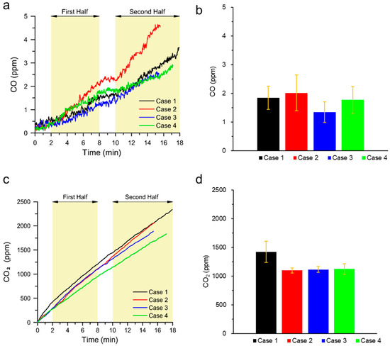Percent per million over time of carbon oxides: (a) CO; (b) Standard deviation of CO; (c) CO2; (d) Standard deviation of CO2.