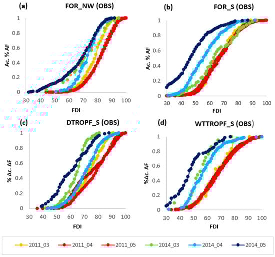 Observed accumulated percentage of active fires by FDI value for the months 03 (March) to 05 (May) of years 2011 (dry year) and 2014 (wet year) for temperate forest of the NW (a) and S (b) regions and for dry and wet tropical forest of the S region ((c) and (d), respectively). Where: FDI: fuel dryness index; Ac.% AF: accumulated percentage of active fires by FDI value; FOR: temperate forest; DTROPF: dry tropical forest; WTROPF: wet tropical forest; NW, S: Northwest and South regions; OBS: observed values; 201x_0x: year_month.