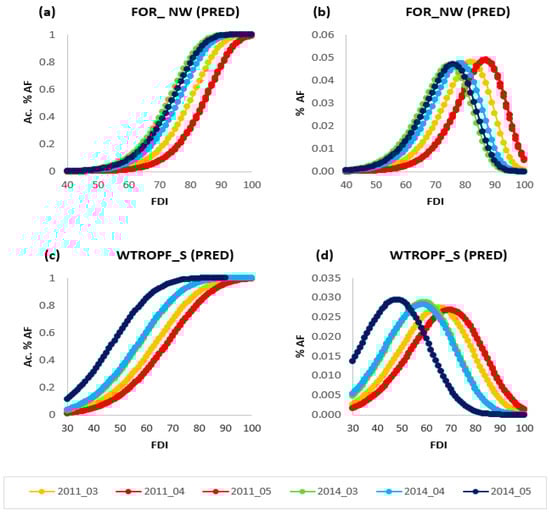 Predicted percentage of active fires by FDI value for the months 03 to 05 of years 2011 (dry year) and 2014 (wet year) for the temperate forest of the NW region (a,b) and wet tropical forest of the S region (c,d). Figures on the left (a,c) show the accumulated percentage, and figures on the right (b,d) show the corresponding percentage of active fires by FDI value. Where: FDI: fuel dryness index; Ac.% AF: accumulated percentage of active fires by FDI value; % AF: percentage of active fires by FDI value; FOR: temperate forest; WTROPF: wet tropical forest; NW, S: Northwest, and South regions; PRED: predicted values; 201x_0x: year_month.