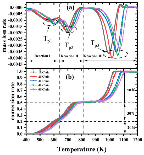 Figure 1 depicts the mass loss rate curves and conversion rate curves of the fireproof sealant sample at five different heating rates in the nitrogen atmosphere. The mass loss rate curves exhibit three distinct peak partitions, indicating the occurrence of three main reactions. The local peaks in the mass loss rate curves are approximately located at 550 K, 700 K, and 1000 K, marked as Tp1, Tp2, and Tp3, corresponding to a conversion rate of about 0.2, 0.5, and 0.8, respectively. It shows that the trends in the mass loss rate curves and the conversion rate curves of the fireproof sealant pyrolysis have not been strongly altered.