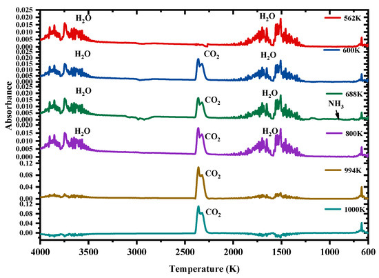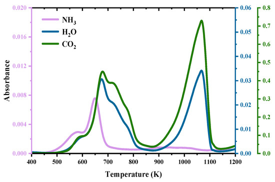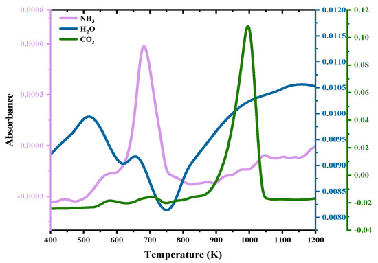 Figure 5 displays the evolution of the three main gases (carbon dioxide, water vapor, and ammonia) by FTIR at 10 K/min under the air atmosphere. Compared with the results for the nitrogen atmosphere, the biggest difference is the trend in carbon dioxide, which was also produced in the range of 600–800 K. Meanwhile, the amount of carbon dioxide produced during oxidative pyrolysis is significantly higher than that produced during pure nitrogen pyrolysis.