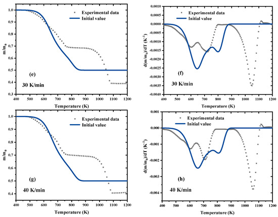 Experimental data (symbols) compared to estimated results (lines) based on the initial parameters values: (a) mass loss at 10 K/min; (b) mass loss rate at 10 K/min; (c) mass loss at 20 K/min; (d) mass loss rate at 20 K/min; (e) mass loss at 30 K/min; (f) mass loss rate at 30 K/min; (g) mass loss at 40 K/min; (h) mass loss rate at 40 K/min.