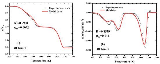 Estimated mass loss and mass loss rate based on the optimized parameters (lines) compared with experimental data (symbols): (a) mass loss at 10 K/min; (b) mass loss rate at 10 K/min; (c) mass loss at 20 K/min; (d) mass loss rate at 20 K/min; (e) mass loss at 30 K/min; (f) mass loss rate at 30 K/min; (g) mass loss at 40 K/min; (h) mass loss rate at 40 K/min.