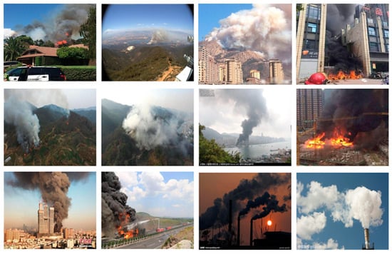 Due to the great risks associated with fire, gathering comprehensive fire images from different scenes through experimental methods is challenging. Most existing fire detection datasets are images of real fires collected via the Internet. However, there are few public fire datasets with annotations. Meanwhile, fire-like objects are rarely considered in existing datasets. For this paper, over 8000 fire and fire-like images were collected from public datasets [40,41,42,43] and web images. These images were manually inspected to remove data with a high level of repetition or low quantity. Finally, our dataset contained 6000 images, including 5274 fire images and 726 fire-like images. The fire images contained a single flame and smoke, multiple flames and smoke, buildings, forests, grassland, and complex background fires. Meanwhile, clouds and chimney emissions were considered typical fire-like objects in the dataset. Correspondingly, there were 5293 labels for flames, 5118 labels for smoke, 733 labels for clouds, and 189 labels for chimney emissions. Figure 2 presents part of the dataset.