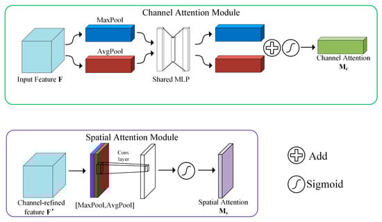where σ(·) is the sigmoid function; MLP is a multilayer perceptron with weights and ; AvgPool(·) indicates the average pooling operation and outputs ; and MaxPool(·) represents the maximum pooling operation and outputs . Thus, we obtain channel-refined feature map F′ using Equation (2):