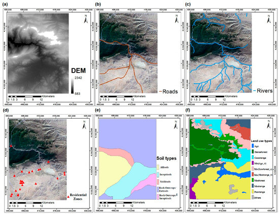 Used data layers in this research (a) DEM, (b) the road network, (c) the rivers, (d) the residential zones, (e) the soil types, and (f) land use.