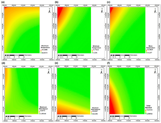 The rasters generated from interpolating (a) maximum temperature (°C), (b) minimum temperature (°C), (c) mean temperature (°C), (d) maximum wind speed (m/s), (e) maximum wind azimuth, and (f) total rainfall (mm) on 17 November 2010.