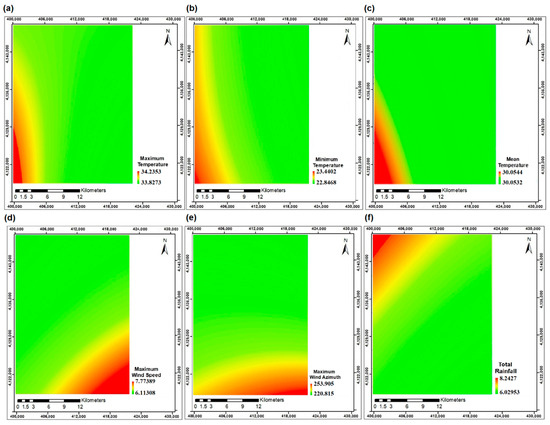 The rasters generated from interpolating (a) maximum temperature (°C), (b) minimum temperature (°C), (c) mean temperature (°C), (d) maximum wind speed (m/s), (e) maximum wind azimuth, and (f) total rainfall (mm) on 15 July 2011.