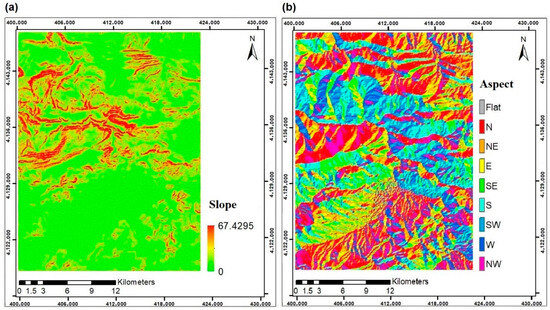 The land use and soil type information layers were on a scale of 1:100,000 and the road network and rivers information layers were on a scale of 1:5000; all of which were acquired in 2006. We used the ASTER 30 m GDEM to generate the slope and aspect layers (Figure 6). The road network, the rivers, and the residential zones information layers were in the vector format. Hence, the Euclidean distance analysis was used to generate raster layers with a resolution of 30 m so that each cell of these layers shows the distance from the nearest road, river, and residential zone (Figure 7).