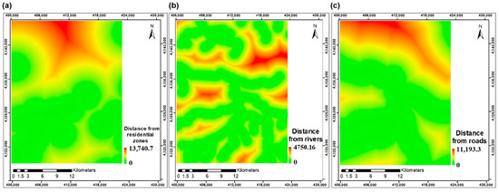 Data layers of distance from (a) residential zones (m), (b) rivers (m), and (c) roads (m).