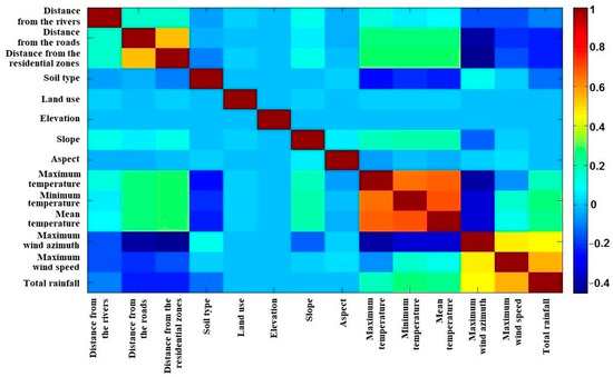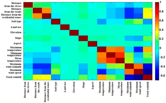 Before executing the algorithm, the correlation among the spatial factor layers was analyzed using Equations (1) and (2):