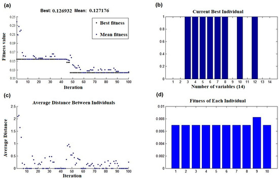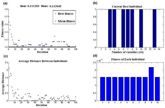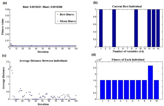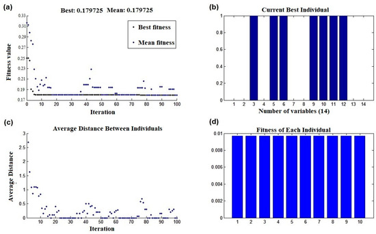 (a) The best and the mean values of fitness, (b) the last best individuals, (c) the average distance between individuals, (d) the fitness of each individual in the last iteration using the GWR method with the tricube kernel and the modified CIWO for 15 July 2011 data.