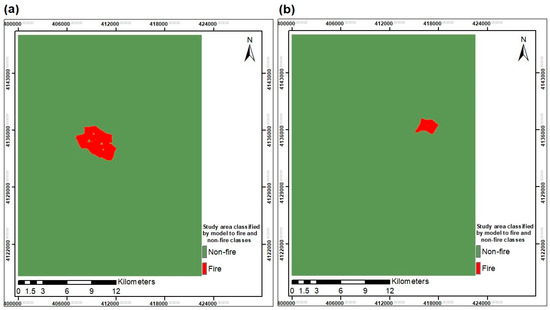 As depicted in Table 5, Table 6 and Table 7, the GTWR method with the tricube kernel demonstrated superior performance compared to the other methods. Given this superior performance, the estimated observations () derived from the GTWR method with the tricube kernel were selected. Subsequently, the estimated fire observations for the entire study area were obtained using ordinary kriging interpolation with a resolution of 30 m and an exponential variogram. This decision was based on the mean bias error, mean absolute error, and global standard deviation values for this dataset, which accounted for 0.001, 10.41, and 16.20% of the values observed with other variogram models, respectively. The resulting outputs are presented in Figure 16. To assess the model’s performance, classification confusion matrices and evaluation metrics are computed, as shown in Table 8, Table 9 and Table 10.