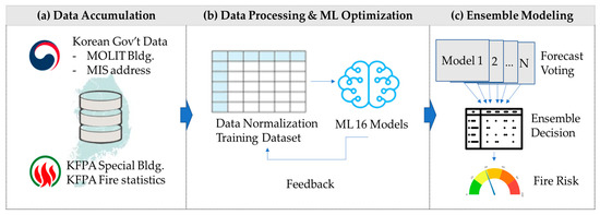 This research focuses on buildings classified as “Special Buildings” (SBs) in the Republic of Korea, which are subject to regular fire safety inspections due to their elevated fire risk. The model classifies these buildings into five distinct fire risk categories, providing actionable insights for stakeholders involved in fire prevention, insurance risk assessments, and emergency response planning. Figure 1 conceptualizes the research framework for building fire risk forecasts using the stacking ensemble method.