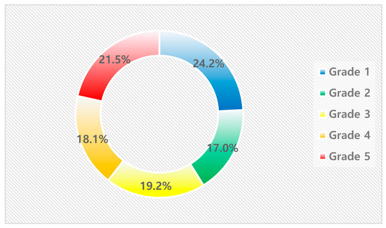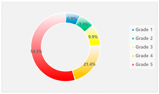 Although the share of predicted buildings remains relatively consistent at around 20% across all grades, the fire occurrence rate and the share of actual fire occurrences increased significantly with each grade. This pattern confirms the effectiveness of the grading system in accurately stratifying fire risk levels. Figure 6 shows the predicted percentage of buildings by class and Figure 7 shows the actual percentage of fires by class.