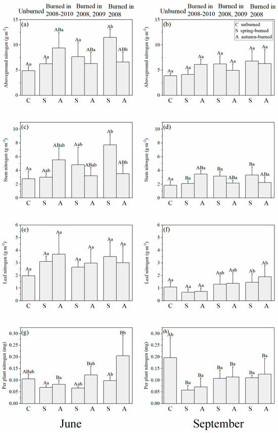Average values for aboveground nitrogen (a,b), stem nitrogen (c,d), leaf nitrogen (e,f), and per–plant nitrogen (g,h) in June and September. Significant differences in time since burning are indicated in lowercase letters, and significant differences in burn season are indicated in uppercase letters (Tukey–HSD test, ANOVA; p < 0.05; capital letters (A/B) indicate differences in burn season, while lowercase letters (a/b) represent differences in time since burning). C: control, S: spring burns, A: autumn burns.