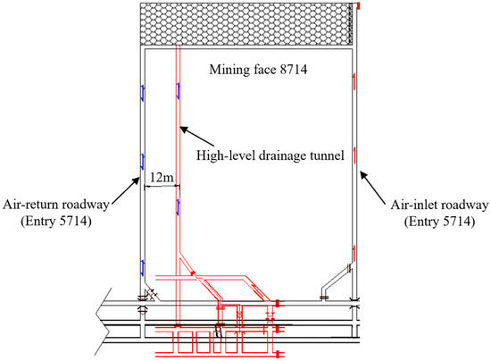 For mining face 8714 of coal seam #12-2, the average mining height is 4.5 m. The air-return roadway is entry 5714, while the air-inlet roadway is entry 2714. The layout of mining face 8714 is shown in Figure 2. The ventilation volume at mining face 8714 is 1879 m3/min. Based on the on-site measurement of the ventilation velocity, the ventilation volume in the air-inlet roadway of mining face 8714 is 2300 m3/min, while the ventilation volume in the air-return roadway of mining face 8714 is 2030 m3/min. During the mining period of mining face 8714, the gas monitoring results show that the lowest oxygen concentration at the mining face is around 18%. Under this working environment, the mining workers often felt exhausted, with tachycardia and perspiration.