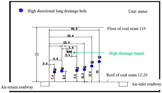 To reduce the cost of a high-level drainage tunnel, a set of high-level directional boreholes are tried and tested at the mining face 8714 of the Jinhuagong coal mine. In this set of high-level directional boreholes, there are six holes that are 7 m, 8 m, 9 m, 10 m, 15 m and 20 m away from the roof of mining face 8714, respectively. In the horizontal direction, these six holes are 3.5 m, 8.5 m, 18.6 m, 23.6 m, 28.6 m and 33.6 m away from the air-return roadway. The layout of these six high-level directional boreholes and the high-level drainage tunnel is shown in Figure 3. However, under the effect of these six high-level directional boreholes, the field measurement results show that the carbon dioxide concentration is around 2% at the upper corner of the mining face 8714 while it is around 1.5% in the air-return airflow, which threatens the safety of mining face 8714.