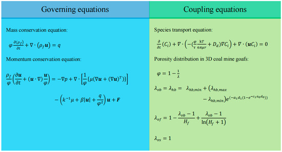 To study the reasonable layout of the high-level directional boreholes, the migration of carbon dioxide in coal mine goaf of mining face 8714 is studied. A gas flow model, shown in Figure 4, consisting of the controlling equations and coupling equations, is constructed to simulate the effect of gas drainage for the coal mine goaf of mining face 8714. In the controlling equations, the mass conversation equation and momentum conservation equation are used to describe the movement of mixture air in the coal mine goaf. The COMSOL (version 5.2a) software was used to realise the numerical simulation. As there are no temperature changes in this study, energy conservation is not included in this gas flow model. The gas is treated as the ideal gas, and the volume force is considered. As the effect of negative ventilation and high-level drainage tunnel on the airflow movement in the coal mine goaf, the flow state of the airflow changes among the laminar flow, turbulent flow and the transition flow. Therefore, the Forchheimer coefficient is considered in this gas flow because it can reflect the influence of inertial force which is vital for the airflow in the coal mine goaf. In the coupling equations, the species transport equation, porosity distribution equation and permeability distribution equations are used to describe the specific engineering environment in the coal mine goaf [44,45]. As the negative ventilation and negative drainage force the gas to flow in the porous goaf, the mechanical dispersion in the porous medium is considered with the molecular diffusion in the species transport equation. As it is difficult to determine the porosity distribution in a coal mine goaf, it is considered that the porosity change is continuous and slow, which is described in the coupling equations.